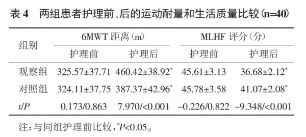 护理后,两组的6MWT距离均增加,MLHF评分均显著降低,且观察组优于对照组(P<0.05,表4)。