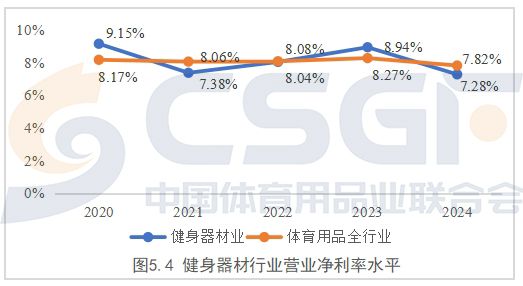 整体上看,行业净利率也呈现微幅下滑趋势,从2020年的9.15%下降到2024年的7.28%,五个年份中有三个年份低于体育用品全行业平均水平。