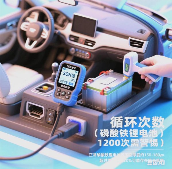OBD诊断仪:通过连接驾驶座下方的诊断接口,可以重点读取电池的SOH值、实际容量(以Ah为单位)以及循环次数。对于磷酸铁锂电池,若循环次数超过1200次,则应引起警惕。