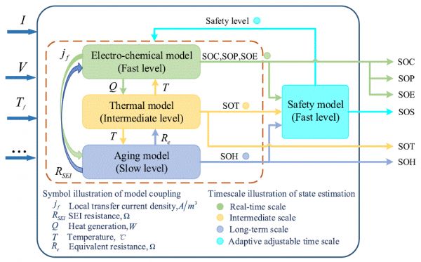 电池动力学通常可以用一个电化学-热-老化耦合模型来精确描述,该多物理耦合模型的每个子模型都具有自己的时间尺度。具体来说,由于微观电化学参数的快速变化,SOC/SOP/SOE等电池状态通常会实时变化。由于电池的物理结构和传热特性,宏观温度分布会在一个中等时间尺度上演变。具有最慢时间尺度的SOH在短时间内只会略有变化,表现为内部阻抗/电阻、容量等参数的缓慢变化。电池SOS可以通过评估上述状态来全面确定。考虑到电池系统的安全等级要求,与SOS相关的系统设计和管理可能会发生变化。图1阐述了电池SOC/SOE/SOH/SOP/SOT/SOS的多时间尺度特性。