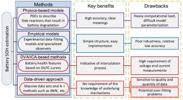 SOH估计方法及关键问题:现有很多方法可以用来估计电池的SOH,并可大致分为四类:基于物理模型的方法、基于经验模型的方法、基于数据驱动的方法,以及基于增量容量分析(ICA)的方法。现有的SOH估计方法总结如图4。
