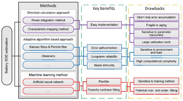 SOE估计方法及关键问题:比之SOC估计,在进行SOE估计时要考虑电池平衡电势的非线性变化特性,因此会变得更加复杂且更具挑战性。到目前为止,已经有相当数量的学者致力于提升SOE估计的可靠性,其研究总结如图3。