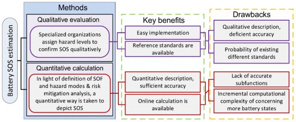 SOS方法和关键问题:基于灾害等级的电池系统安全评估是一项重要的任务。但SOS估计是电池状态估计领域中一个最新出现的课题,有许多关键问题需要进一步解决。目前的SOS估计方法总结如图7,主要包括电池安全性的定性评估和定量计算。