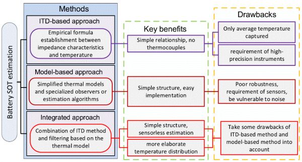 SOT估计方法及关键问题:基于温度(包括表面温度以及环境温度)、阻抗等测量数据,利用各种观测器结合简化的热模型或者经验阻抗模型可以实现电池温度分布的在线估计。SOT估计的分类如图6所示,包括基于阻抗-温度监测的方法、基于热模型的方法以及融合方法。