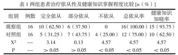 观察组患者治疗依从率为100.00%,健康知识知晓率为93.75%,明显高于对照组的75.00%、62.50%,差异明显(P<0.05),见表1。