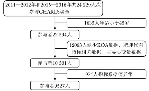 基于中国健康与养老追踪调查(China Health and Retirement Longitudinal Study, CHARLS)数据, 分析肥胖及相关代谢指标与中老年人群(≥45岁)膝骨关节炎(knee osteoarthritis, KOA)发病风险的关系。
