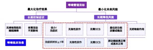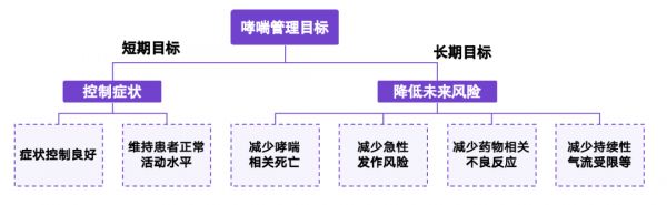 中国哮喘治疗目标[4]与 GINA 一致:哮喘治疗目标在于达到哮喘症状的良好控制,维持正常的活动水平,同时尽可能减少急性发作和死亡、肺功能不可逆损害和药物相关不良反应的风险。