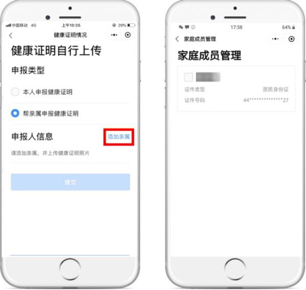 帮亲属申报健康证明:在“申报人信息”版块点击“添加亲属”,在“家庭成员管理”页面点击“添加家庭成员”,按提示完善亲属信息上传健康证明照片。