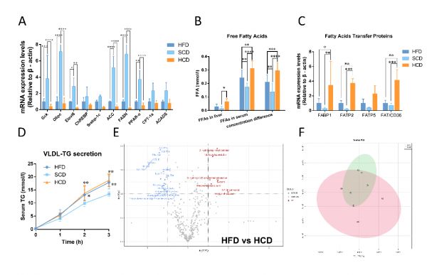 NAFLD的最主要特征是肝脏内甘油三酯的大量堆积。肝内的甘油三酯含量由5条代谢途径共同决定,其中包括 3条“经典”脂质代谢途径:“糖酵解-脂质从头合成”途径、“ChREBP-脂质从头合成”途径、“脂肪酸β氧化”途径;2条“非经典”脂质转运途径:脂肪酸转运入肝途径、VLDL-TG复合体转运途径。通过对以上5条代谢途径中关键酶进行测定,我们发现高淀粉饮食仅在脂肪酸转运途径中表现相较于高脂饮食组小鼠的表达量提升。同时,结合肝脏代谢组学分析数据,进一步证实了以上发现(图二)。从而表明在高淀粉饮食干预下,脂肪酸内流的增加是导致肝内甘油三酯进一步沉积的主要原因。