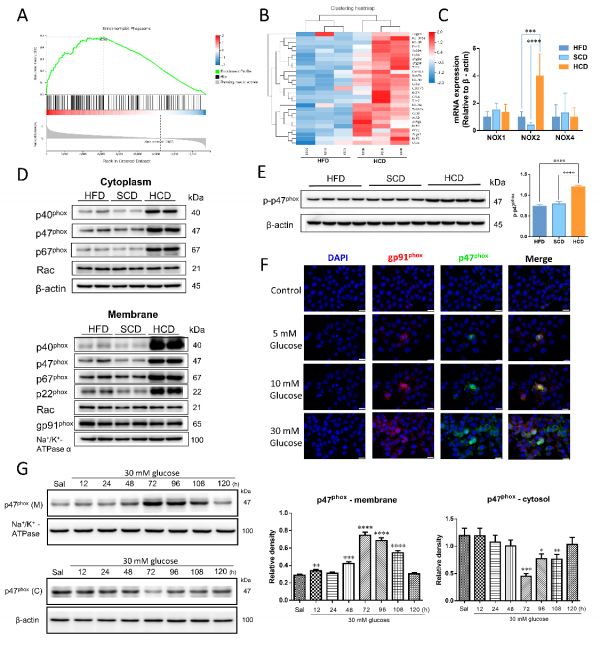 为明确高淀粉饮食加重NAFLD的分子调控机制,我们对饲喂高脂饮食以及高淀粉饮食的小鼠进行了肝脏转录组学的测定,通过联合运用KEGG、GO、GSEA分析,并依据前期实验表型,聚焦与炎症、代谢相关,且基因表达差异以及基因变化数量显著的通路,发现在吞噬体通路中,高淀粉饮食组小鼠表现出相较于高脂饮食组小鼠的显著激活,并且,吞噬体通路中NADPH氧化酶各个亚基含量显著提升。随后,我们在细胞以及动物水平均证明了NADPH氧化酶亚型NOX2以及NOX2亚基在高淀粉饮食条件下,表达量显著升高,并表现出NOX2激活的关键特征,即胞内亚基向胞膜转移的现象(图三)。同时,肝内的NOX2高表达同步表现为肝内活性氧水平的显著提升。从而证明高淀粉饮食介导肝内NOX2高表达、促进NOX2组装及功能发挥。