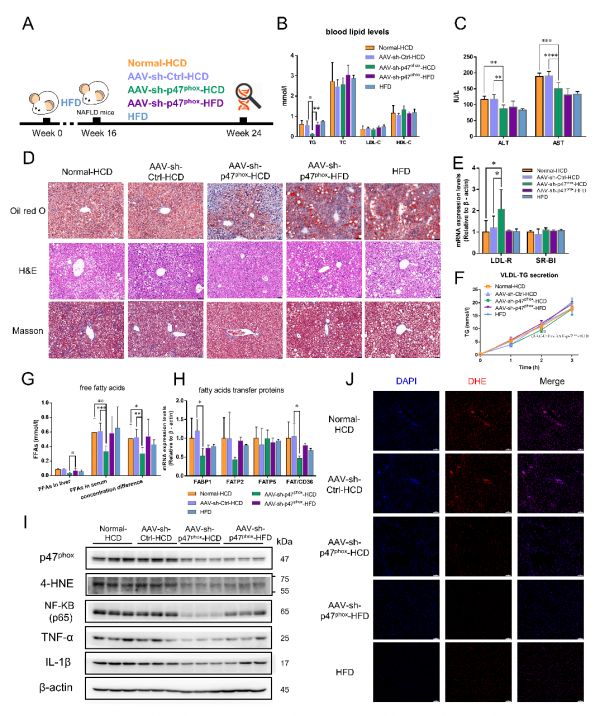 为进一步证明高表达的NOX2是高淀粉饮食介导NAFLD恶化的主要原因,我们在NAFLD小鼠中通过腺相关病毒构建了肝脏特异性敲低p47phox(介导NOX2组装的关键亚基)的小鼠,并同步将小鼠饮食更换为与高脂饮食等热量的高淀粉饮食。研究发现,敲低p47phox可以抵抗高淀粉饮食所致的肝内脂质堆积、炎症因子浸润以及纤维化加重,但是在继续维持高脂饮食的小鼠中,敲低p47phox并不会表现出相应的缓解作用。同时,在高淀粉饮食条件下,敲低p47phox的小鼠表现出肝脏脂肪酸转运的抑制和肝内活性氧水平的降低(图四)。此外,通过分析细胞活性氧来源以及能量感知分子AMPK的活性表达,进一步提出NOX2介导的活性氧是NOX2调控脂肪酸转运的关键分子,并且论证得到AMPKα1/p47phox是高淀粉饮食介导NOX2高表达的依赖途径。