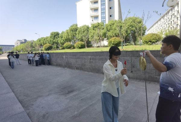 四平八稳项目里,同学们依次平拿材料板运送小球,面对小球掉落的挫折,大家不轻易放弃,调整姿势、控制速度,在反复尝试中培养心理韧性;蒙眼敲锣项目中,蒙眼的同学在队友的语言指引下克服恐惧、找准方向,在信任与配合中学会依靠团队力量破解困境,提升心理素质。