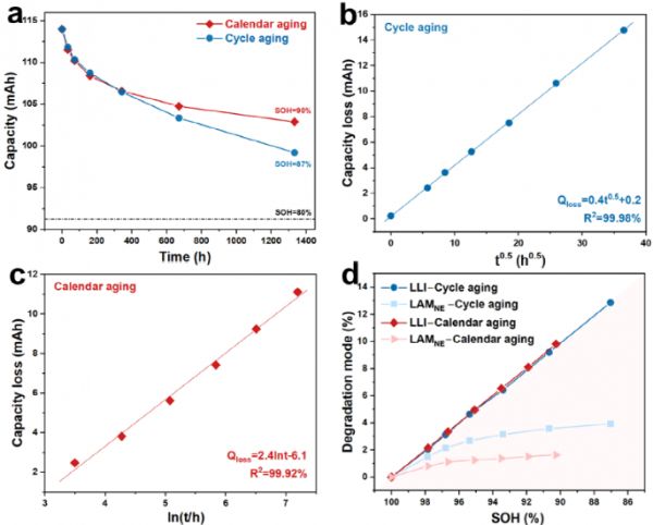 图1. LFP/Gr软包电池在65℃下日历老化和循环老化的容量衰退和老化模式诊断。
