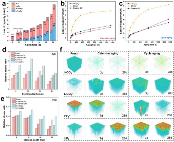 图3. 循环老化及日历老化过程中的SEI成分演变分析。
