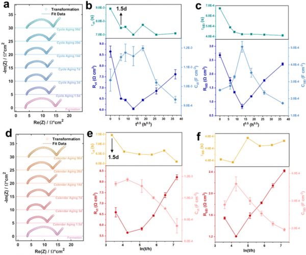 图2. 循环老化及日历老化过程中的阻抗和各拟合参数的演变。