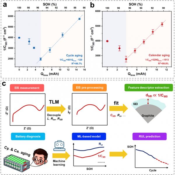 图4. SEI电容、容量损失和SOH之间的定量关联以及CSEI的使用示意图。