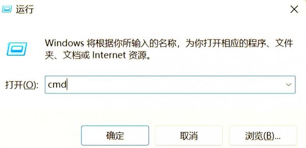 按下Win键和R键组合,打开运行窗口,输入cmd后点击确定或回车。