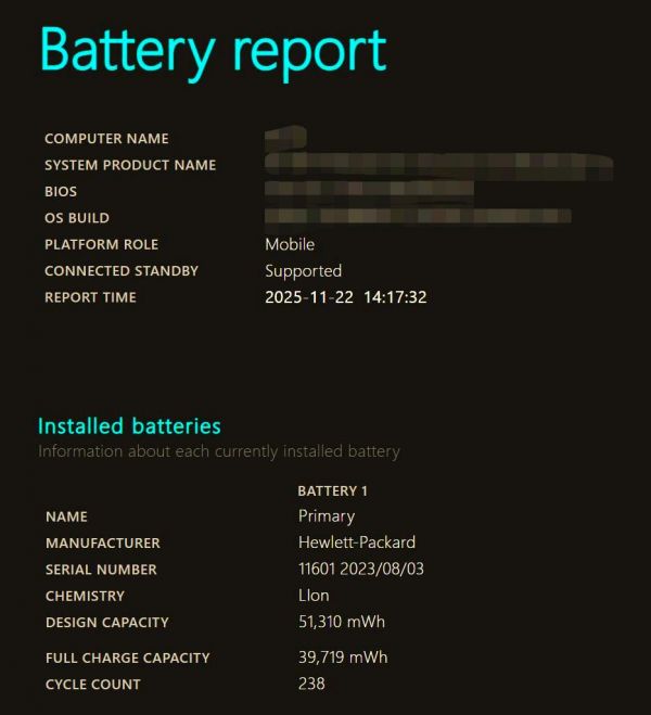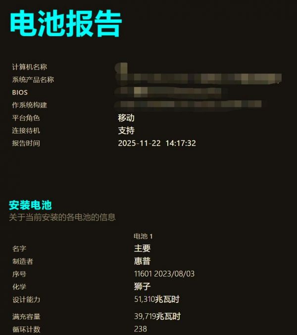 电池的健康度可以通过一个简单的公式来评估:满充容量除以设计能力,再乘以100%。以我的笔记本为例,其电池健康度为39719/51310100%=77.41%,这意味着电池的当前容量已降至原始设计能力的77.41%。由于电池已经循环了238次,其续航能力已有所下降,因此我可能需要考虑更换电池。