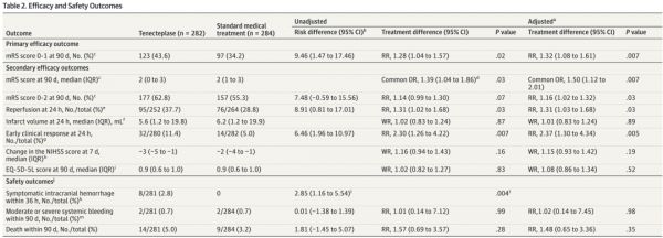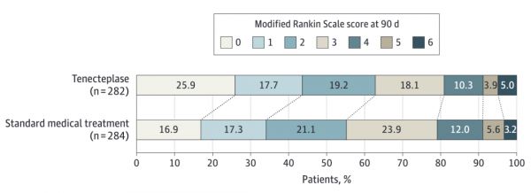 随后,这些患者被 1:1 随机分配至替奈普酶组和标准治疗组中,前者接受一次替奈普酶推注,后者则接受抗血小板治疗。