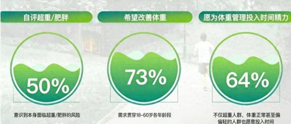 半数大众自评目前有超重风险,七成大众有体重管理的意识、希望改善体重,超六成原为体重管理付出努力,投入时间和精力
