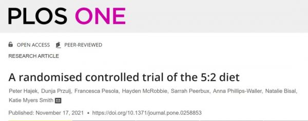 Peter Hajek, Dunja Przulj, Francesca Pesola, Hayden McRobbie, Sarrah Peerbux, Anna Phillips-Waller, Natalie Bisal, Katie Myers Smith. A randomised controlled trial of the 5:2 diet. PLOS ONE, 2021; 16 (11): e0258853 DOI: 10.1371/journal.pone.0258853