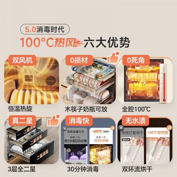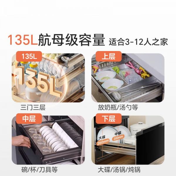 注意:别只看“总容量”,看“有效容量”——有些消毒柜设计不合理,支架占空间大,实际能放的餐具少。优先选“可拆卸分层支架”的,上层放碗筷,下层放大盘、锅具,空间利用率更高。