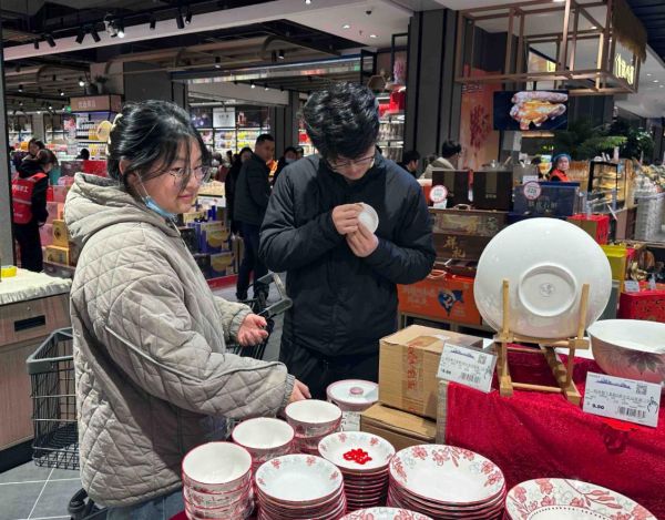 记者在现场看到,该超市碗盘销售专区已搭建大型堆头,多种款式、不同价位的碗盘整齐陈列,琳琅满目。红色福字款、简约纯色款、创意异形款、复古花纹款等一应俱全,吸引众多市民驻足挑选、对比询价。据佳和城购物广场超市主管楚喜梅介绍,今年春节前碗盘品类上新力度远超往年,套系数量从去年的30余个增至40余个,单品达400余种;价格跨度从单价三四元的普通瓷碗到上千元一套的高端骨瓷餐具,可满足不同消费层次市民需求。“自腊月初一开始,我们就将碗盘专区设在超市最显眼的位置,腊八过后正式进入销售旺季,现在每天销售额都能超过1万元。”楚喜梅说。