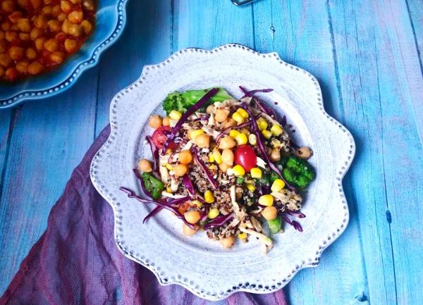 使用熟鹰嘴豆和多种多样的清新蔬菜,搭配独特的油醋汁,形成健康且富有营养的沙拉。