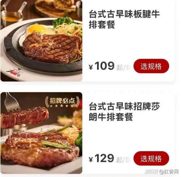 点单小程序显示,呷牛排推出的14款牛排套餐里,就包括了在台湾餐厅和夜市里比较常见的台式古早味板腱牛排套餐、台式古早味招牌沙朗牛排套餐。
