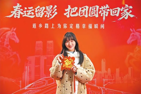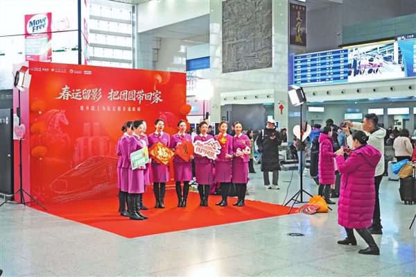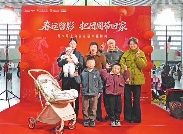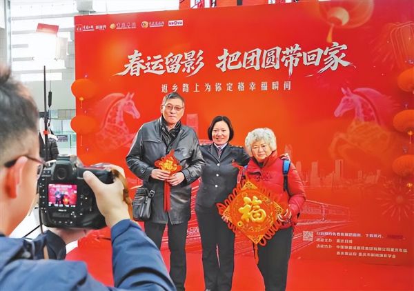大厅一隅,红彤彤的“春运留影 把团圆带回家”返乡旅客合影活动背景板前,相机快门声从未停歇。这场由重庆日报发起的公益摄影活动,自春运启动以来,每天都有温情故事发生。