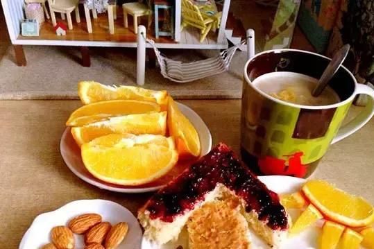 早:大米粥(一小碗)、全麦面包(一片)、橙子一个。
