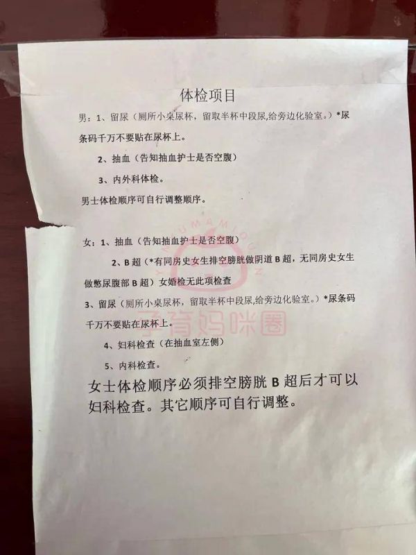 男婚检:内科、外科、抽血、验尿(精液检查需要单独收费,且在检查前需禁欲3-5天)