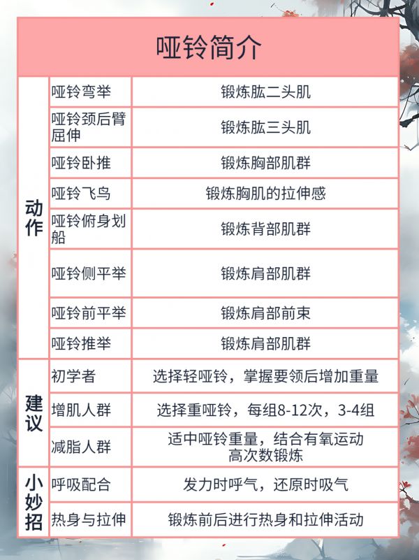 哑铃锻炼是一种简单有效的健身方式,通过掌握经典8个动作和针对不同人群的锻炼建议,你可以在家中轻松打造完美身材。