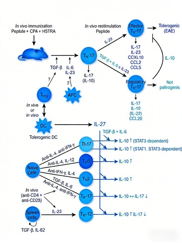 IL-10家族细胞因子:IL-10属于Ⅱ类细胞因子家族,其成员包括IL-10、IL-19、IL-20、IL-22、IL-24及IL-26。IL-10作为家族原型成员,主要由活化的T细胞、单核巨噬细胞及树突状细胞产生,是免疫系统中最具代表性的负调控细胞因子。