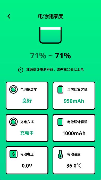 电池寿命检测app手机版通过先进的算法和数据分析技术,实时监测设备的电池状态。它不仅能显示当前的电量百分比,还能预测剩余电量的使用时间,包括通话时长、上网时长、视频播放时长等。此外,软件还提供了详细的电池健康度报告,帮助用户了解电池的老化程度和性能状况。
