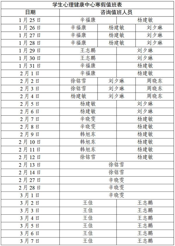 心理咨询接待服务时间为上午8:30-11:30,下午2:30-5:30,咨询排班如下: