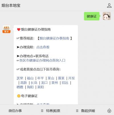 温馨提示:微信搜索公众号【烟台本地宝】,关注后在对话框回复【健康证】,可获取烟台健康证办理流程、材料、地点,以及电子健康证办理流程、入口、咨询电话等,持续更新!