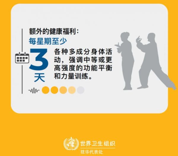 2.在每周身体活动中,推荐进行多样化的身体活动,侧重于中等或更高强度的功能性平衡和力量训练,并坚持每周3天或3天以上,以增强功能性能力,防止跌倒。