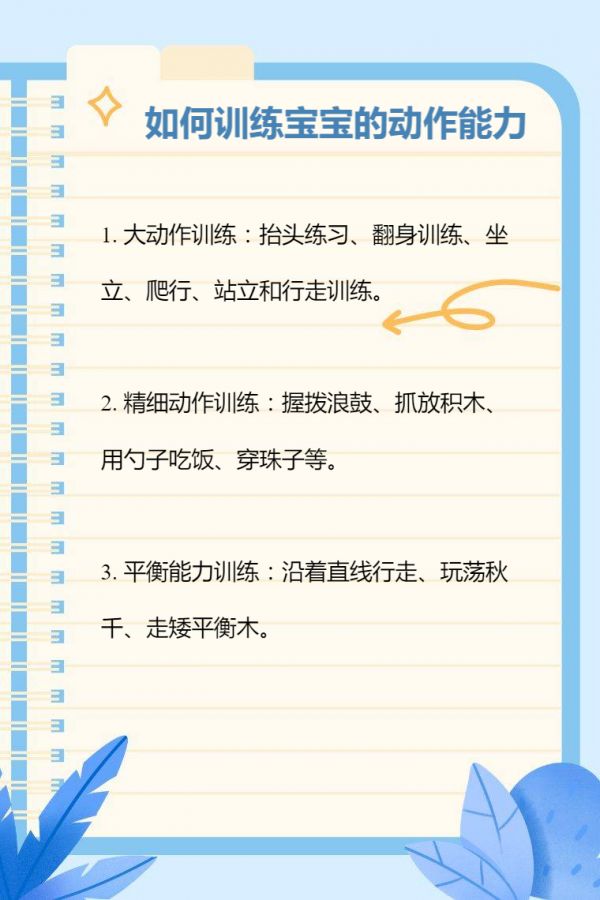宝宝动作能力训练要循序渐进,根据宝宝年龄和发育情况适度进行。训练环境要安全,避免宝宝受伤。如果在训练过程中发现宝宝动作发展明显落后或有异常表现,应及时咨询专业人士。