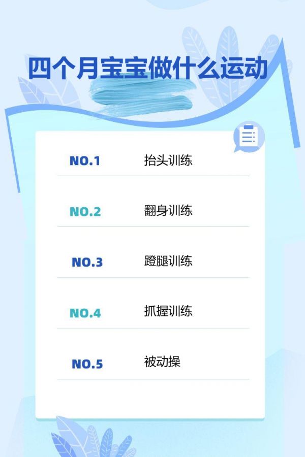 四个月宝宝可做的运动有抬头训练、翻身训练、蹬腿训练、抓握训练、被动操等。