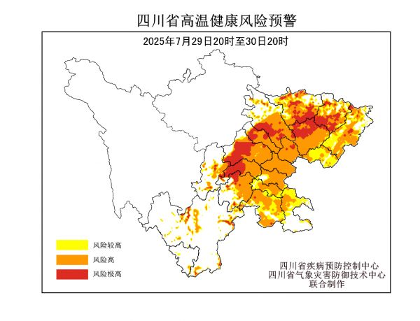 7月29日,四川省气象局与省疾病预防控制局联合发布《四川省高温健康风险预警》,这是我省首次由气象与疾控部门跨领域协作推出的高温健康专项预警。该预警明确标注了7月29日20时至30日20时全省范围内的高温健康风险等级,包括风险较高、风险高、风险极高三个层级,为公众提供了精准化的区域防护指引,标志着四川在高温健康防护领域迈入协同化、精细化服务新阶段。