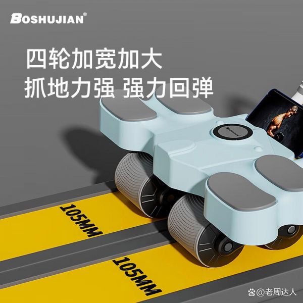 四轮加宽加大: 博舒健四轮健腹轮采用加宽加大设计,轮距达到105MM,这种设计大大增强了轮子的抓地力,使运动更加稳定。仿车胎纹路的轮面设计,有效提升了在多种地面上的适应能力,减少了滑动风险,确保了使用者在锻炼过程中的安全。