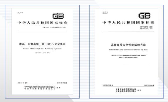 随着社会的进步和发展,人类的生活水平不断得到提高,儿童家具的种类越来越多。而儿童高椅作为儿童家具常见的一个种类走进了千家万户,成为现代家庭生活中不可或缺的一部分。另外,随着我国“三胎”政策和配套支持措施的陆续实施,加上育婴观念的改变,母婴相关产品,如儿童高椅的消费需求也大幅增加。巨大的消费需求端促进了儿童家具生产企业的发展,这就要求儿童高椅生产企业更加以标准为纲,生产符合标准的儿童高椅产品。儿童高椅产品的执行标准是——GB 22793.1-2008《家具 儿童高椅 第1部分:安全要求》(以下简称为“GB 22793.1”)和它的试验方法标准GB/T 22793-2022《儿童高椅安全性能试验方法》(见图1)。本期,秘书处就GB 22793.1进行标准解读,若有不妥之处,欢迎批评指正。