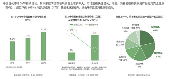 巨量引擎联合TT观潮(Business TrendTalk)、超能发布的《2024年家清行业绿色消费新趋势白皮书》中提到,中国日化家清行业市场规模持续增长,其中安全健康、绿色环保成为消费者最为关注的要素,占比分别高达69%和67%。