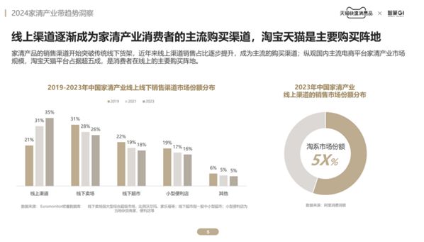 据淘天集团与研究咨询服务机构智篆GI联合发布的《2024家清产业带趋势洞察》,家清产品的销售渠道开始突破传统线下货架,线上渠道销售占比逐步提升,成为家清产业消费者的主流购买渠道。