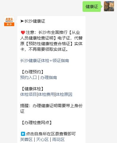 温馨提示:微信搜索公众号【长沙本地宝】,关注后在对话框回复【健康证】可获长沙健康证办理地点及领证入口,查看各区县各个医院健康证办理指南,包含时间、项目、电话等信息。