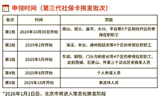 重要通知:自2026年1月1日起,旧版社保卡将停止发放,新申请办理的社保卡将全部为第三代产品。为了帮助您更好地了解换发进度,我们特别整理了详细的时间表。您可以对照自己的情况,查看自己属于哪一批次。请务必关注您的换发时间,以免错过升级机会。