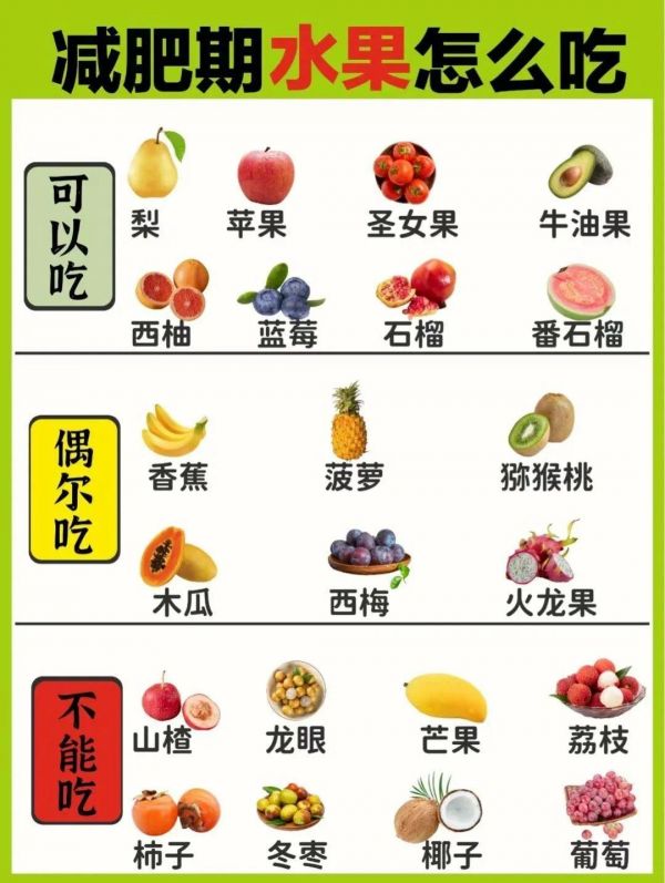 减肥期间可以吃一些低热量的水果,比如梨、苹果、圣女果、西柚、蓝莓、草莓等。千万不要吃一些高热量的水果。比如榴莲、荔枝、芒果、冬枣、椰子等。