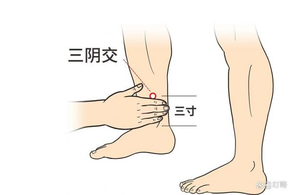 三阴交穴在小腿内侧,内踝尖上3寸,胫骨内侧缘后方。