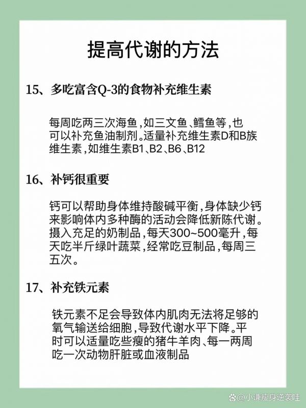 确保你的饮食中含有充足的维生素和矿物质,它们对维持健康的新陈代谢至关重要。比如,维生素D、钙、铁都是支持代谢不可以忽视的微量营养素。